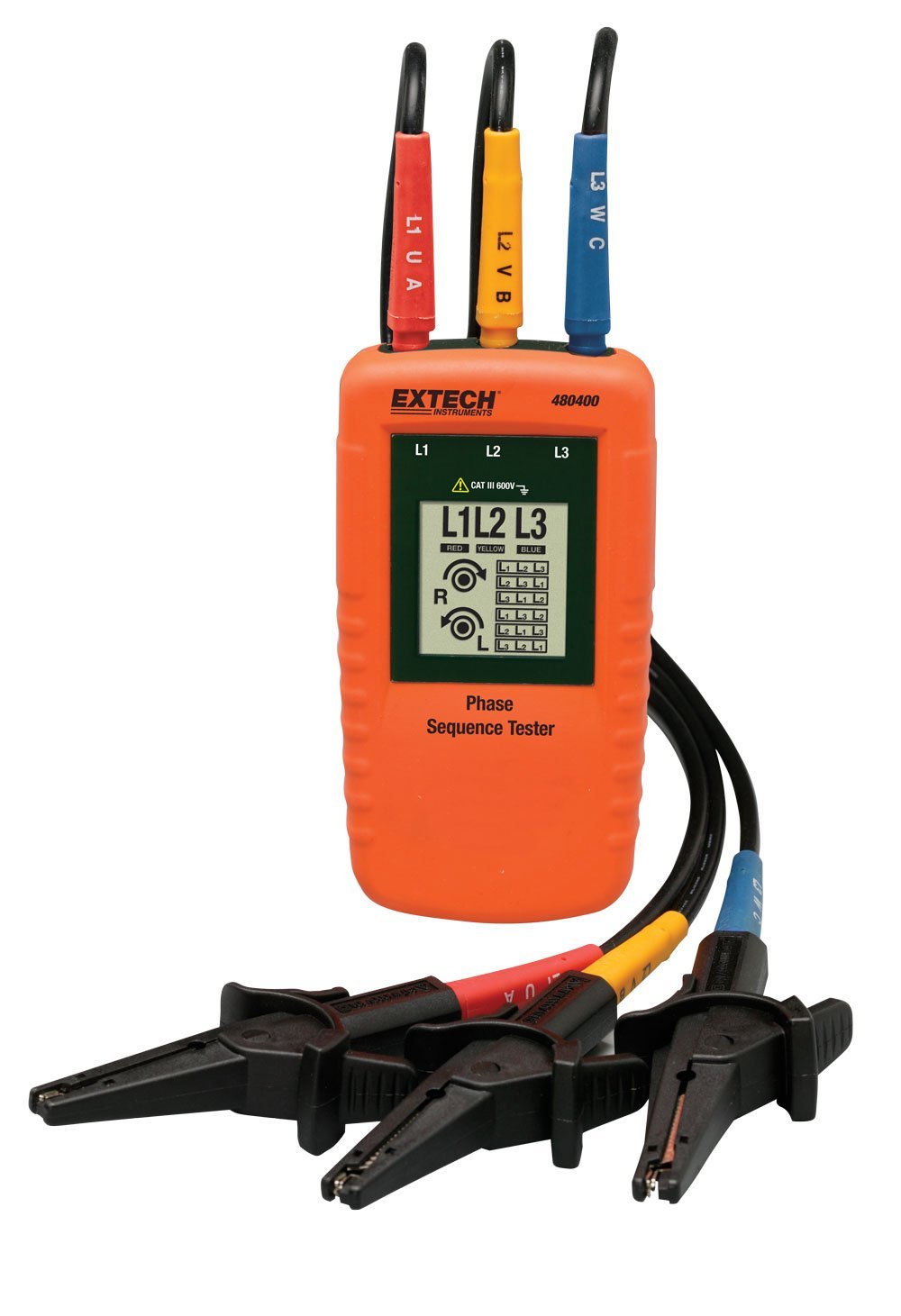 The 480400 Phase Sequence Tester has a 40 to 600-Volt rated range for testing phase orientation of 3-phase power sources over a 15 to 400Hz frequency range. Multiline graphical LCD indicates phase orientation (clockwise or counter-clockwise) and whether each of the phases is live. No battery required. Comes complete with cable, three large color coded alligator clips, and pouch case.