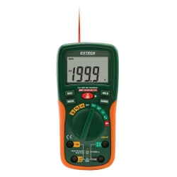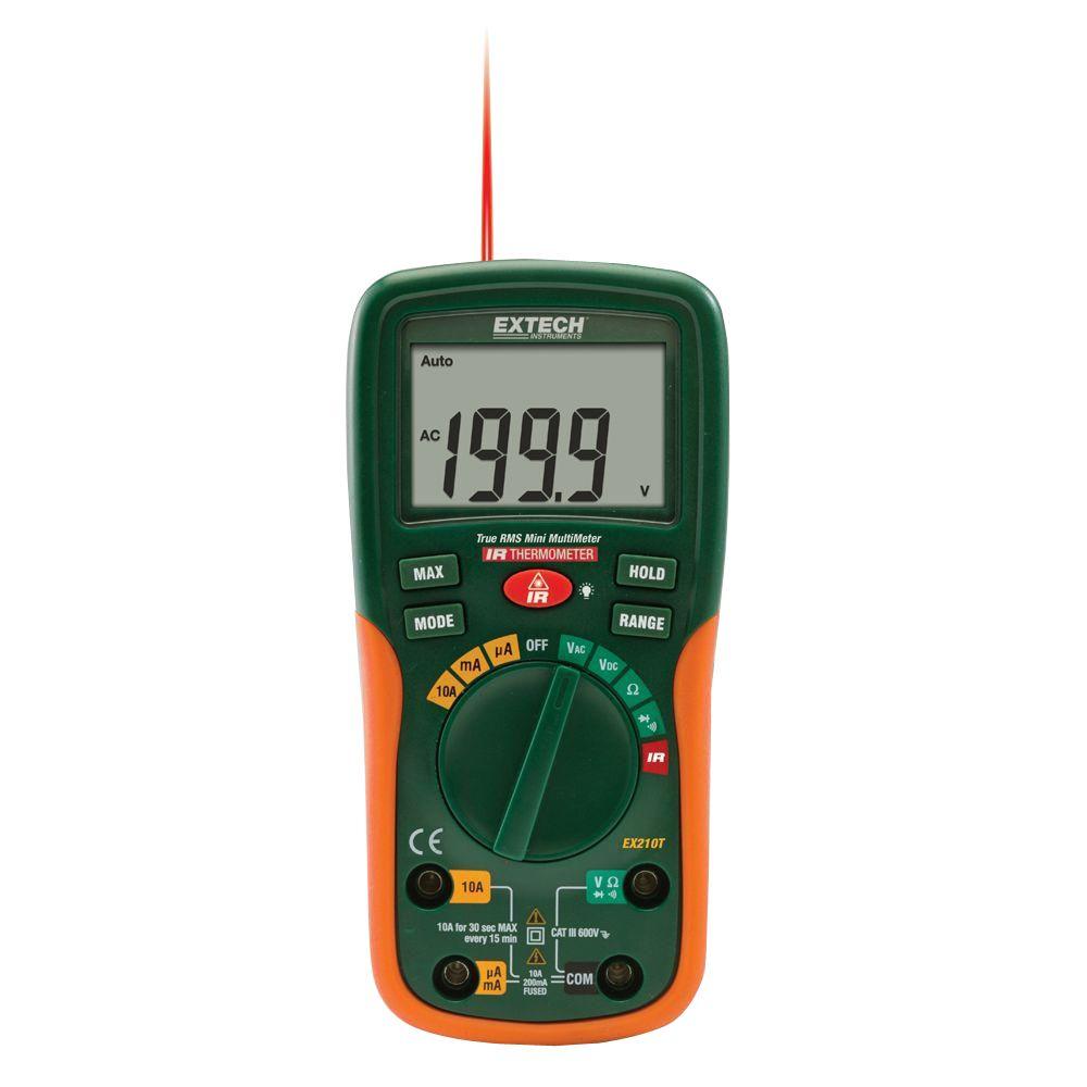 The EX210T is a TrueRMS Digital Multimeter with IR. The meter auto ranges and has a 2000 count large LCD display. Measures AC/DC voltage and Current, Resistance and Temperature (IR). Its True RMS measurements make this meter more accurate and reliable when measuring distorted waveforms and its built in IR thermometer has a 4:1 distance to target ratio, visually aided by the built in laser pointer. This meter has a CAT III 600V safety rating and is complete with a year warranty, test leads and a 9V battery.