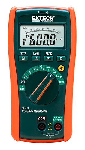 The EX363 is a Compact HVAC True RMS MultiMeter with a Built in Non Contact Voltage Detector. Featuring highly accurate True RMS measurements, LoZ for the prevention of false readings caused by ghost voltages, .5% basic accuracy, a 1000V AC/DC volt range, resistance up to 40MO, continuity beeper with visual alert, smart data hold, peak hold, auto power off with disable, relative mode for capacitance zero and offset adjustment. Additionally, the EX363 excels in HVAC flame rod measurements with a µA function, as well as Type K Temperature measurements from -40 to 742°F (-40 to 394°C) and Frequency and Capacitance measurements. Complete with test leads, 9V battery, holster with tilt stand, general purpose bead wire temperature probe and built-in magnet.