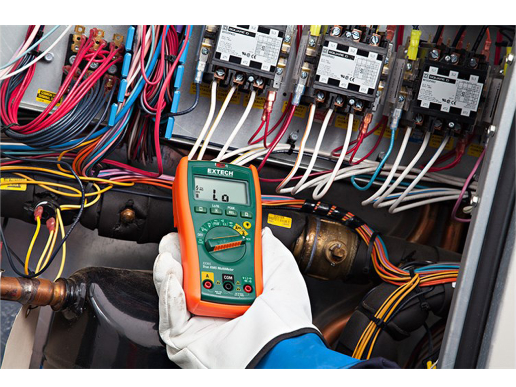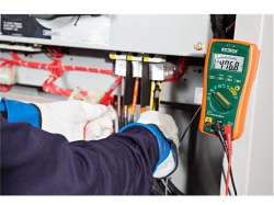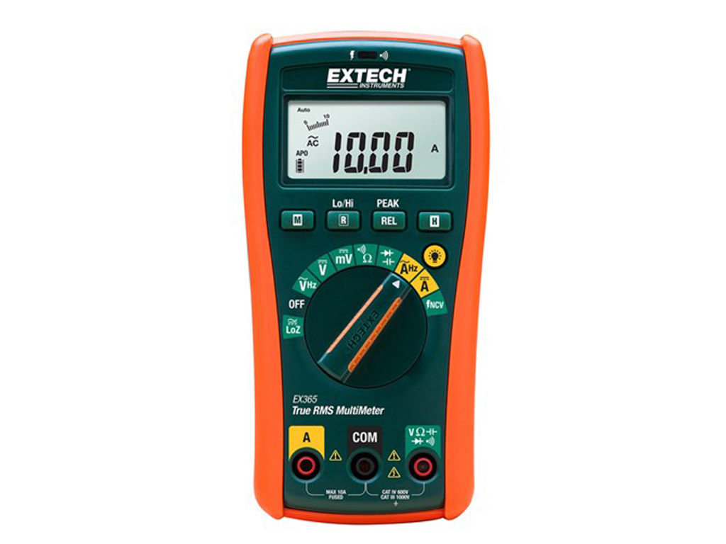 The EX365 is a Compact Industrial True RMS MultiMeter with a Built in Non Contact Voltage Detector. Featuring highly accurate True RMS measurements, LoZ for the prevention of false readings caused by ghost voltages, .5% basic accuracy, a 1000V AC/DC volt range, resistance up to 40MO, continuity beeper with visual alert, smart data hold, peak hold, auto power off with disable, relative mode for capacitance zero and offset adjustment. Additionally, the EX365 excels in frequency and capacitance measurements as well as commercial applications which require AC/DC current measurements from 1 mA to 10A. Complete with test leads, 9V battery, holster with tilt stand and built-in magnet.