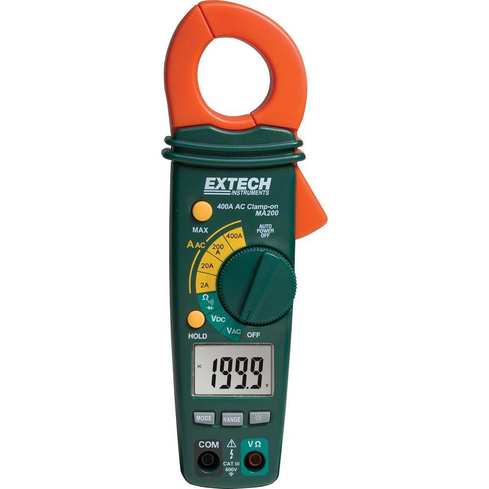 The Extech MA200 Compact Clamp Meter has a 2,000 count LCD display with high accuracy for current measurements. It has a 0.9" (23mm) jaw size that accommodates conductors up to 300MCM. This meter has a continuity beeper and a diode test as well as the data hold feature and the max hold feature. Also, the MA200 has overload protection for all ranges, over range and low battery indicators. This Extech meter has autoranging with an auto power off function. The Extech MA200 Compact Clamp Meter comes complete with test leads, a carrying case and two AAA batteries.