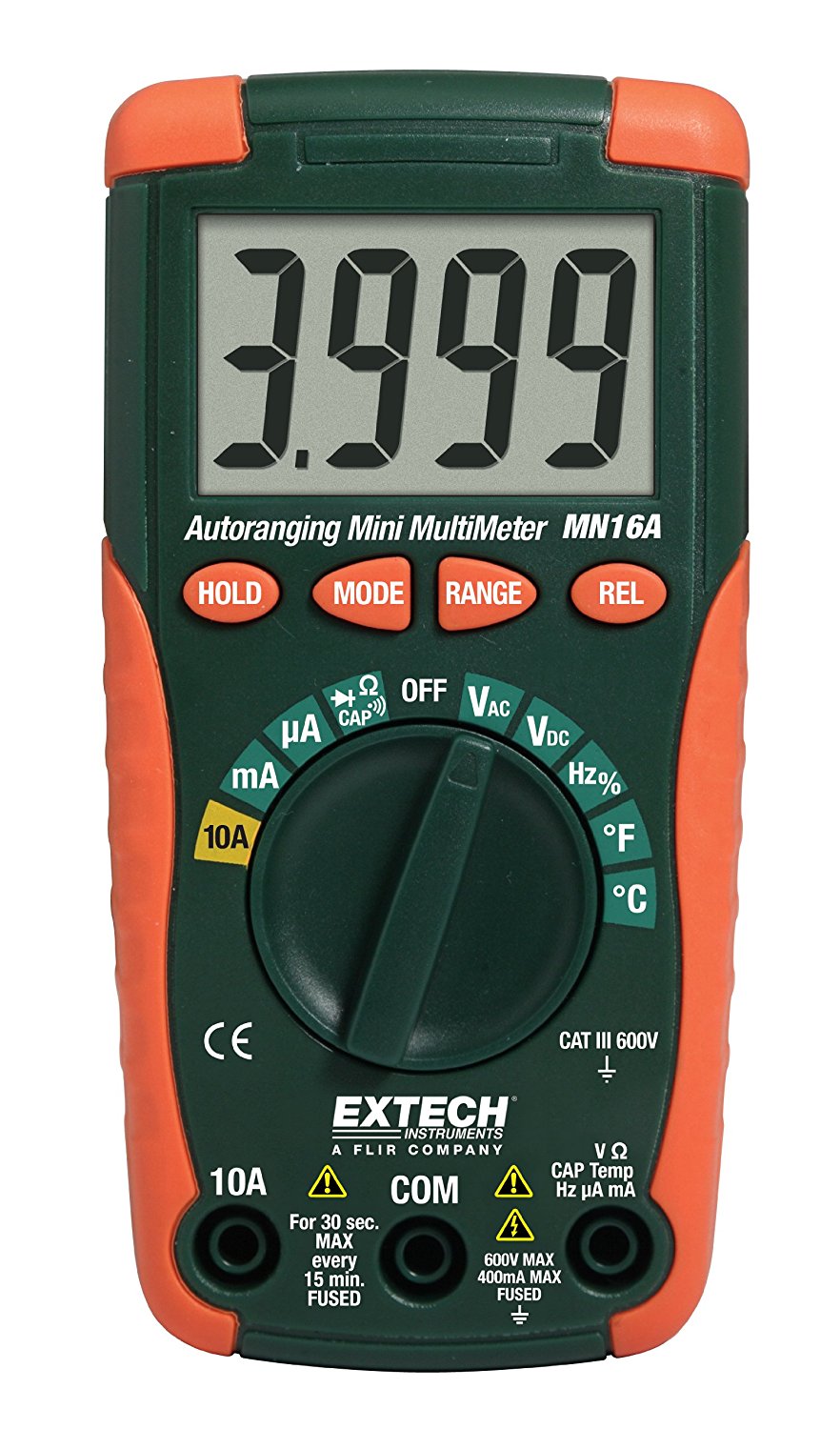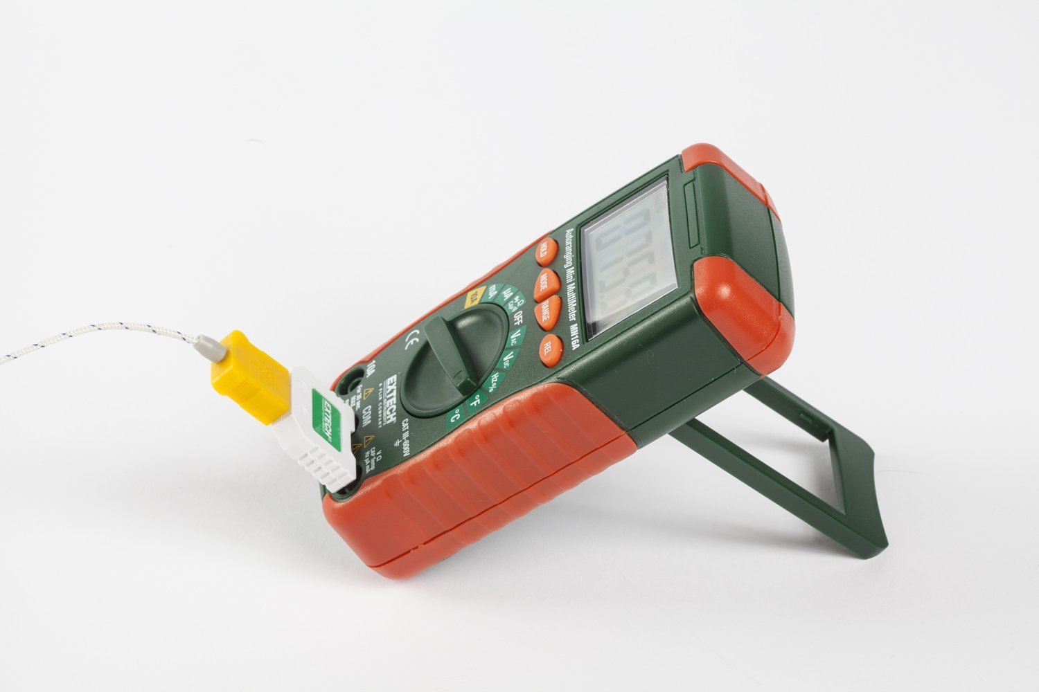 The MN16A is a Digital Mini Multimeter. Measures AC/DC Voltage and Current, Resistance, Capacitance, Frequency, Continuity, Diode Test, Type K Temperature and Duty Cycle. In addition, it has an Auto power off with disable feature. Measurements are viewed on a large, easy-to-read LCD display. Product complete with two AAA batteries, general purpose Type K bead wire probe and test leads.