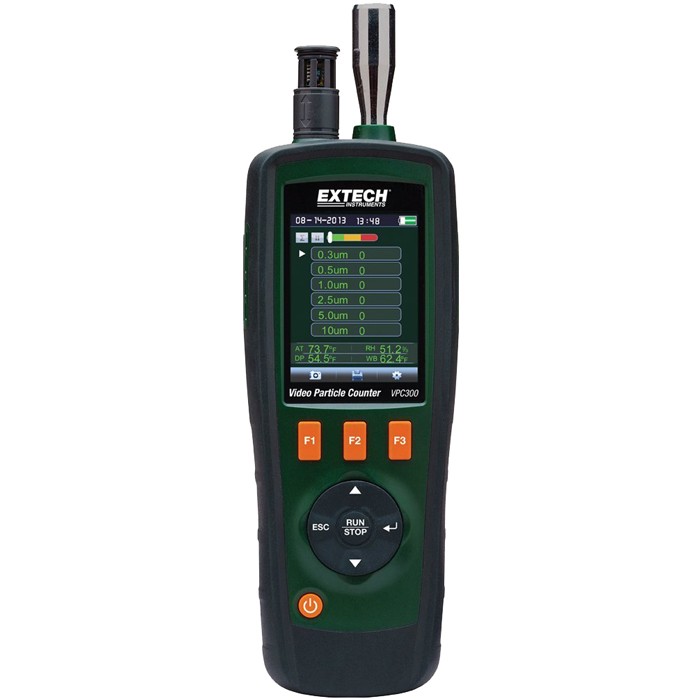 The VPC300 is a Video Particle Counter with built-in Camera. Measures up to 6 channels of particle sizes plus air temperature and relative humidity. Used for capturing videos and photos that are stored onto internal memory or a micros card. The VPC300 can measure up to 6 channels of particle sizes plus air temperature and relative humidity. Use the included software to generate reports with videos, photos and data points. Complete with NIST-traceable calibration certificate, Universal AC Adapter/Charger with multiple plugs, USB cable, PC software, tripod, filter, 7.4V NiMH battery and a hard, protective case.