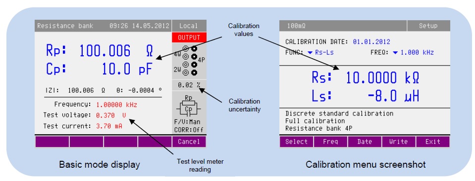The calibrator offers either coaxial output terminals for calibration of four-pair terminal LCR meters, and banana four mm terminals for two- and four-wire connection. OPEN and SHORT reference positions are available as well. Calibrator is equipped with meter of test signal which displays frequence, voltage nad current of test signal. Easy recalibration system offers either full recalibration in all spot frequency points or simplified offset calibration. History of calibration values of partial standards at reference frequency 1 kHz can be easily recalled.